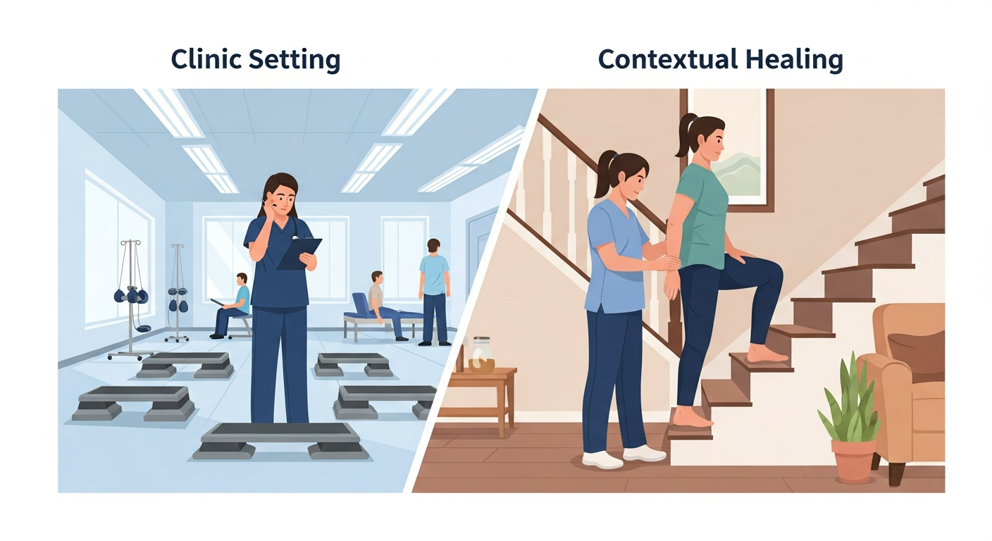 In-home physiotherapy allows you to practice functional movements on the exact surfaces and obstacles you navigate daily, unlike the highly controlled environment of a clinic.